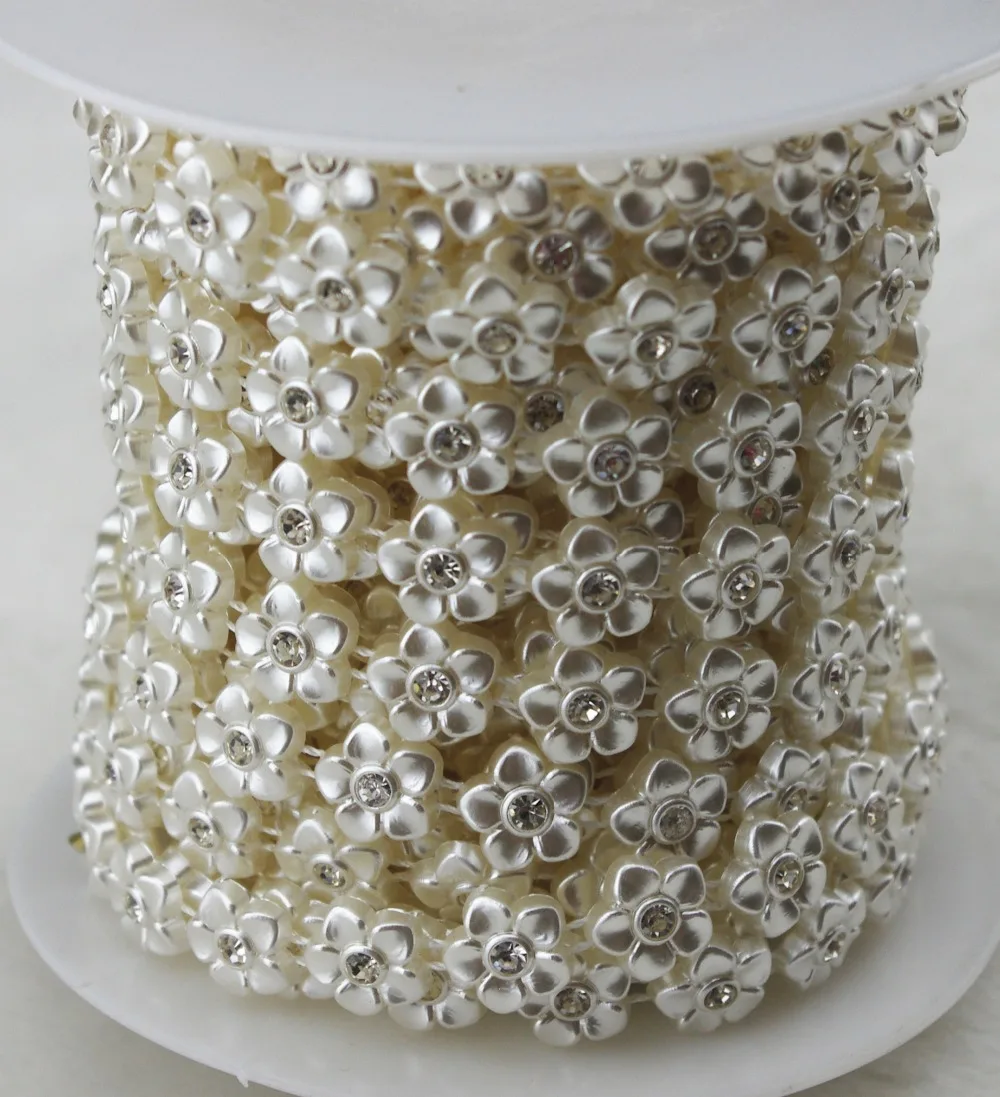 10y 10mm flower Shaped ivory Pearl Rhinestone Chain Trims Sewing Crafts Costume Applique Wedding De
